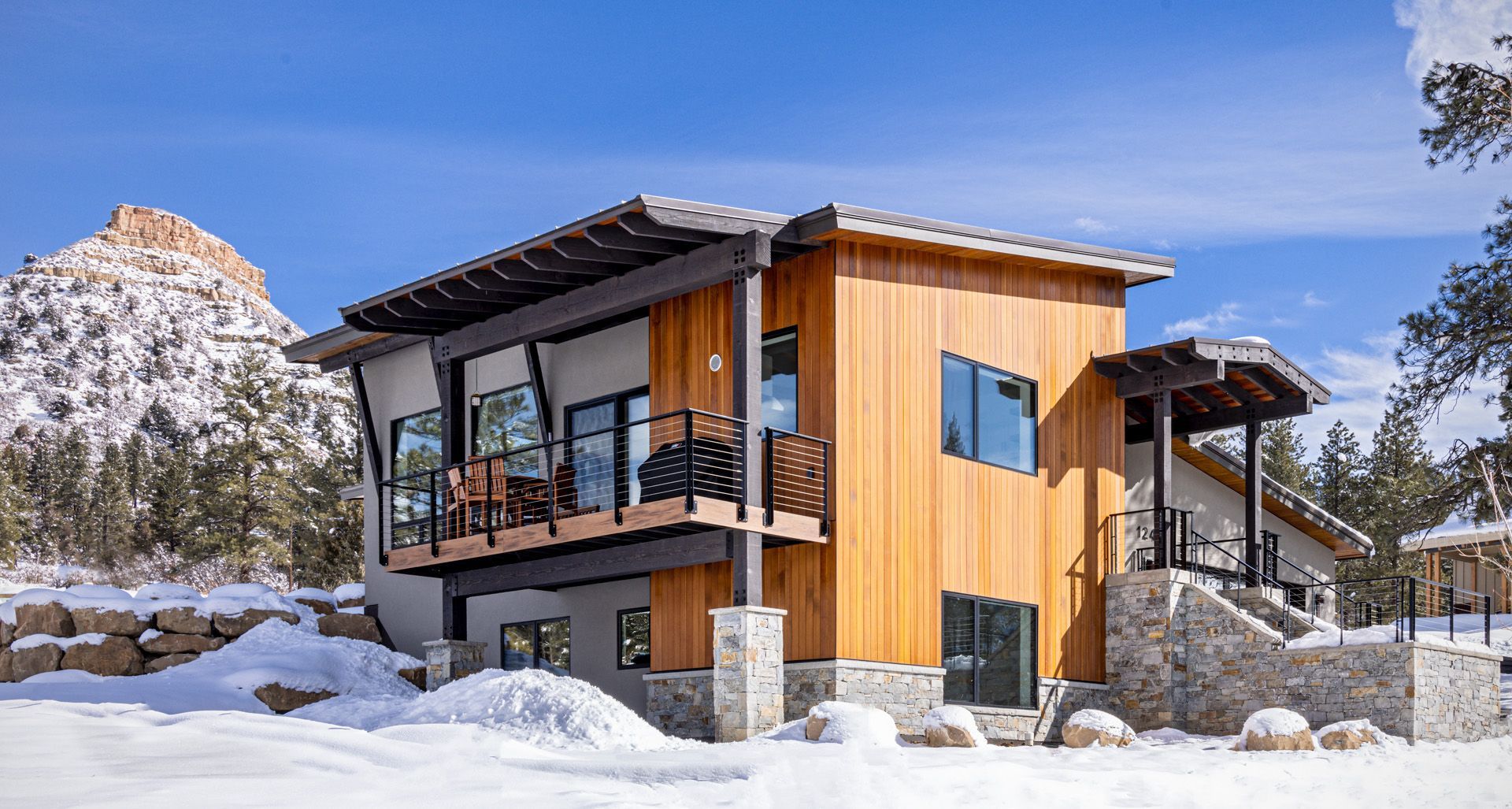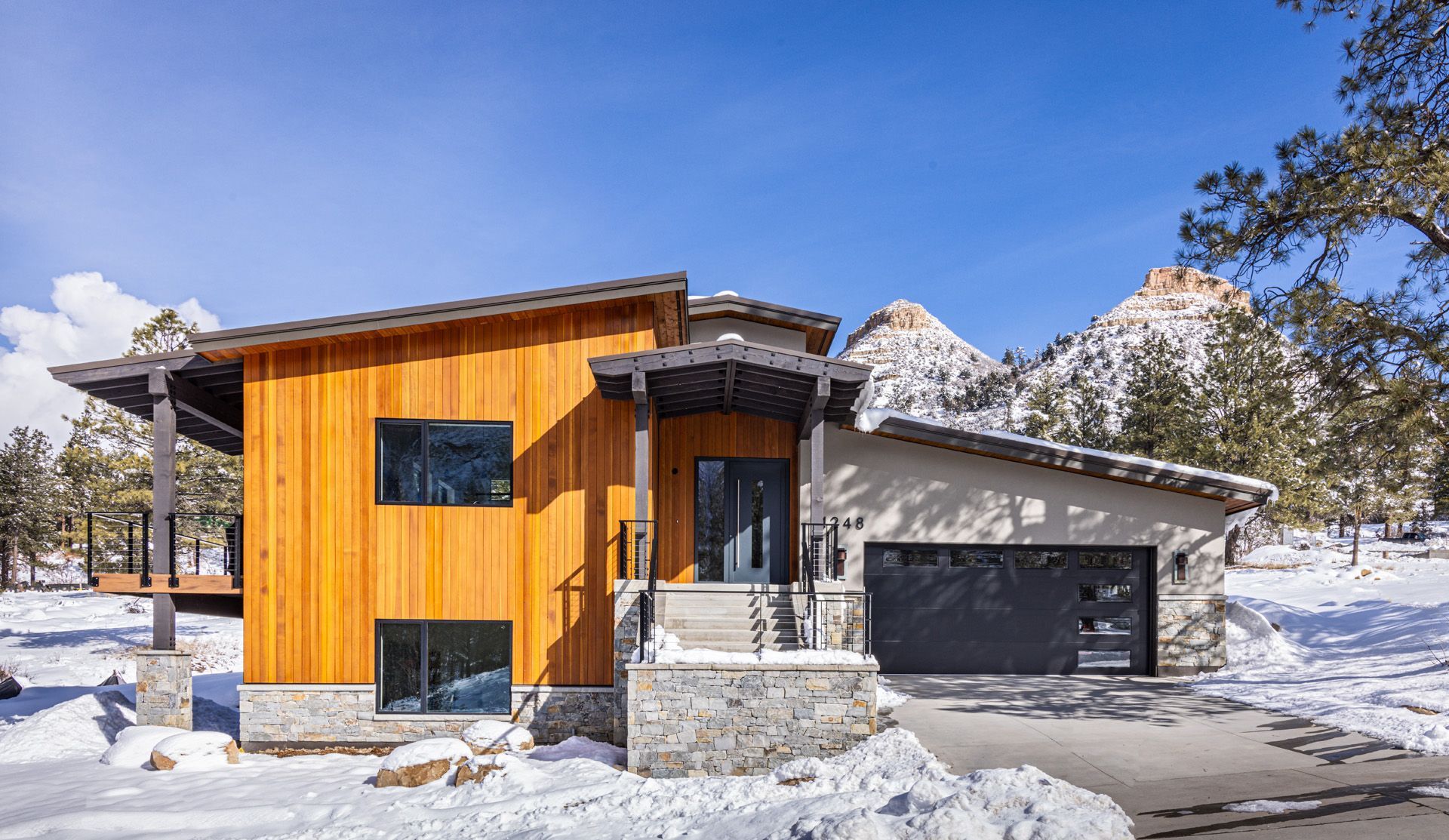 The property offered topographic challenges along with amazing view opportunities in 3 directions. The design build team of the owners, MHB, Brian Huff of Reynolds-Ash Architect created this stunning mountain modern design. The floor plan is focused on unfiltered views of the Twin Buttes to the North and mountain ridge lines to the West from the great room and master.